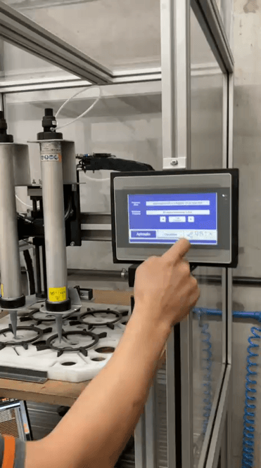 Nesta aplicação, um robô colaborativo (cobot) foi implementado para automatizar o processo de aplicação de cola em componentes de fogões, como a fixação de grades e bocais.